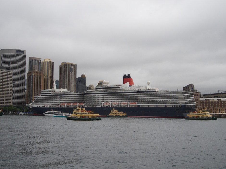 When we arrived in Sydney we found that the Queen had got there before us. She is tied up right in the city centre and is a dominating presence in the passenger dock.