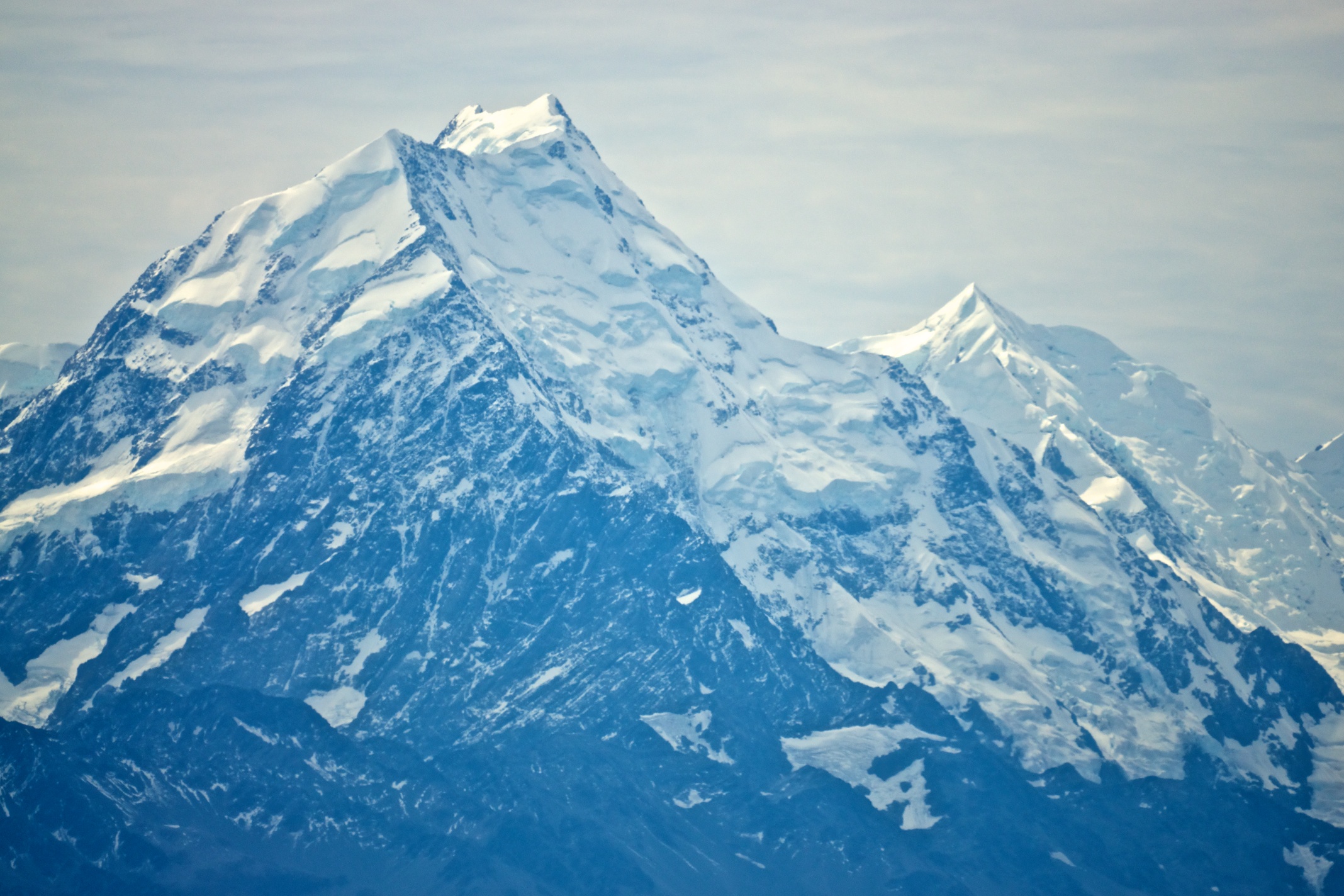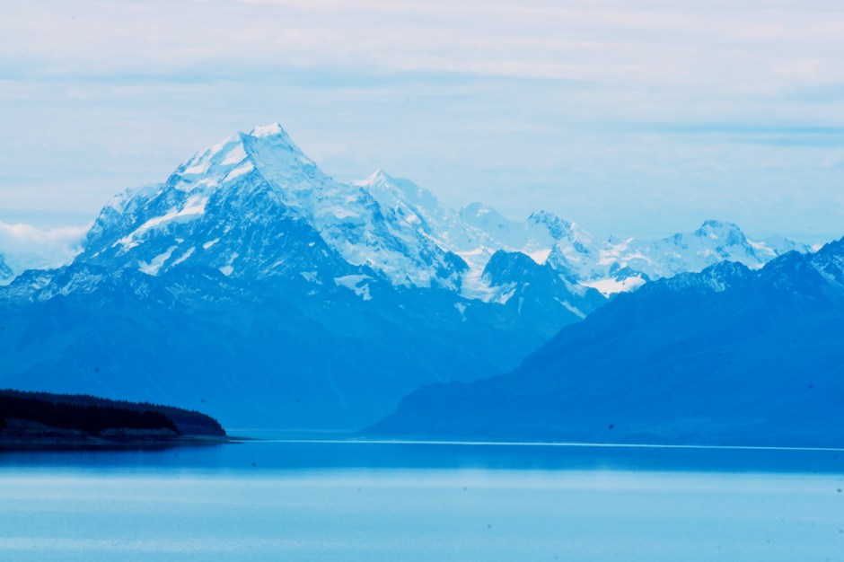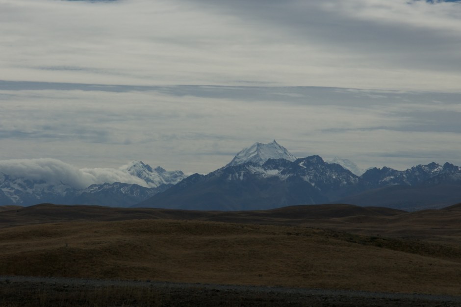 Driving beyond Lake Tekapo we left the main road and headed cross country following an enormous man-made canal channelling water from Lake Tekapo to Lake Pukaki, to feed a large hydro-electric plant. Whilst driving along the side of the canal we got our first glimpse of Aoraki Mount Cook (the name was changed by law a few years ago so that it the English name is prefaced by the original Maori one), the highest mountain in New Zealand (3754m).
