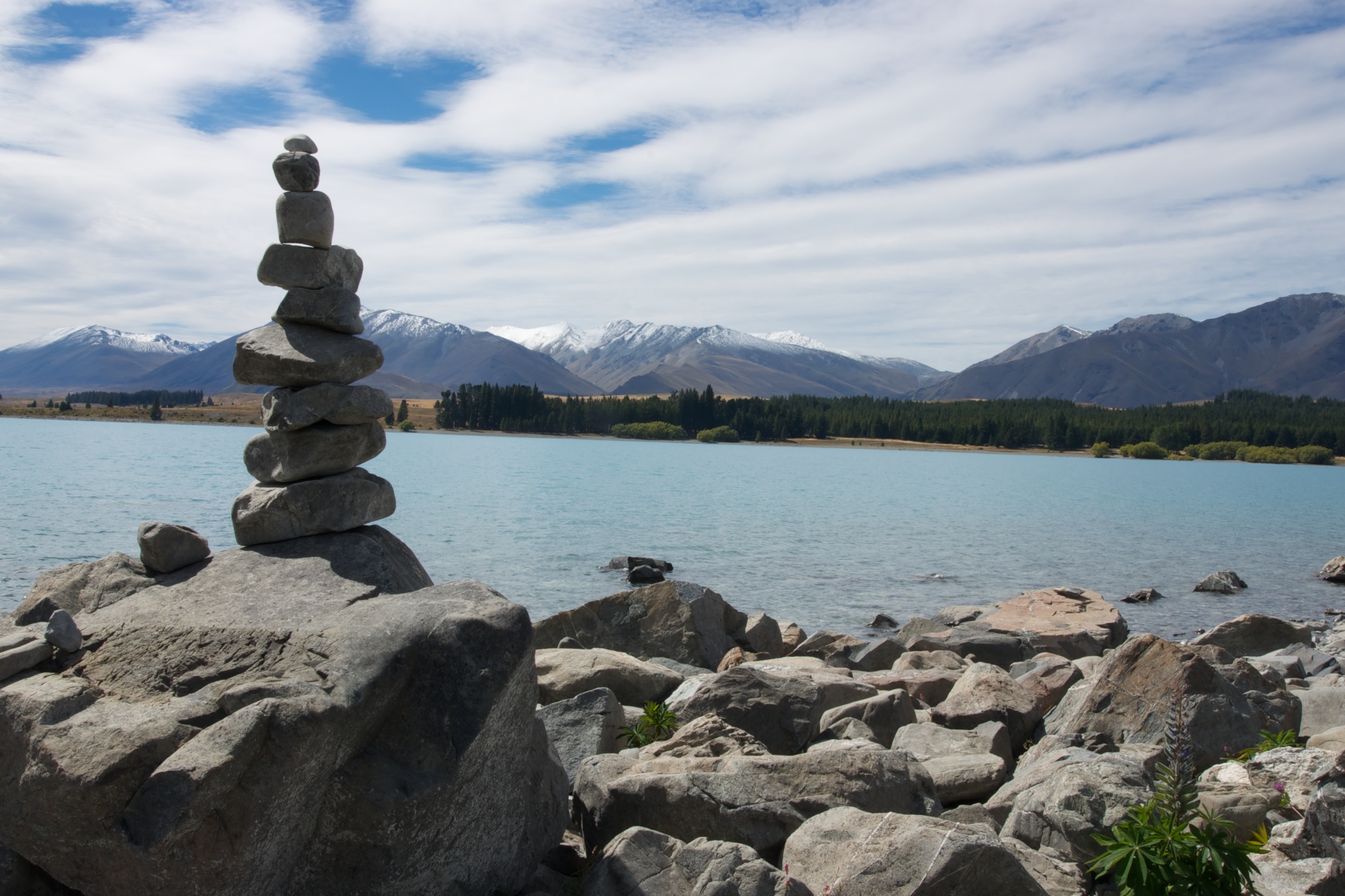 At the side of the lake is a monument to James Mackenzie and his sheepdog, and it has become the fashion to build small cairns along the lake side in memory of the dog (which, in the fashion of the times is I suppose presumed to have higher instincts than his owner). The picture below shows one such cairn, of the many hundreds along the shore, with the mountains behind.