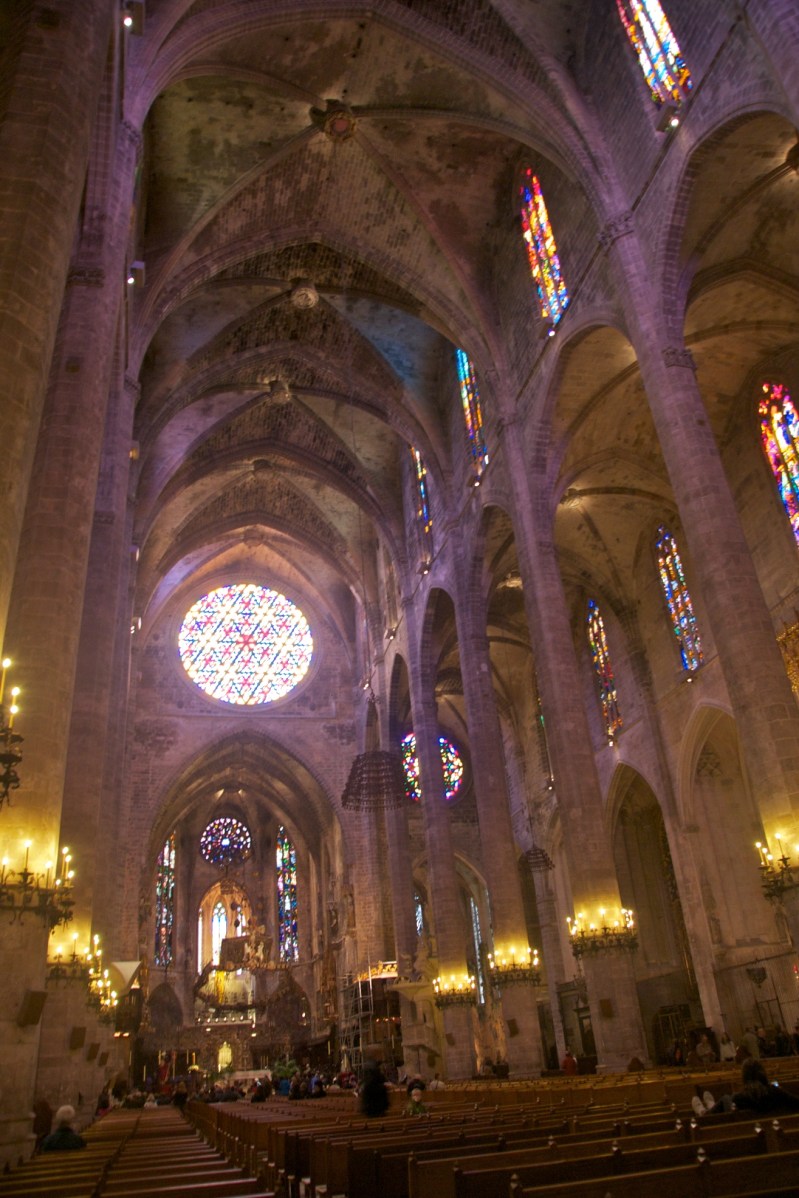 We had the opportunity to spend last weekend in Majorca. The weather was ‘mixed’ at best but we did some a few snatches of sunshine, and it was an opportunity to visit Palma Cathedral amongst other places. I’m not sure I’m hugely attracted by the Cathedral from the outside. It certain has presence and sits on the coast with a great view out to sea (and a long standing navigation point for ships approaching the harbour). It took some 400 years to build, stating around 1229 and is clearly on eof the great cathedrals of Europe. Inside the external bulk makes more sense is the builders decided to use huge external buttresses to keep the internal columns very narrow whilst still being one of the tallest cathedral naves in Europe.