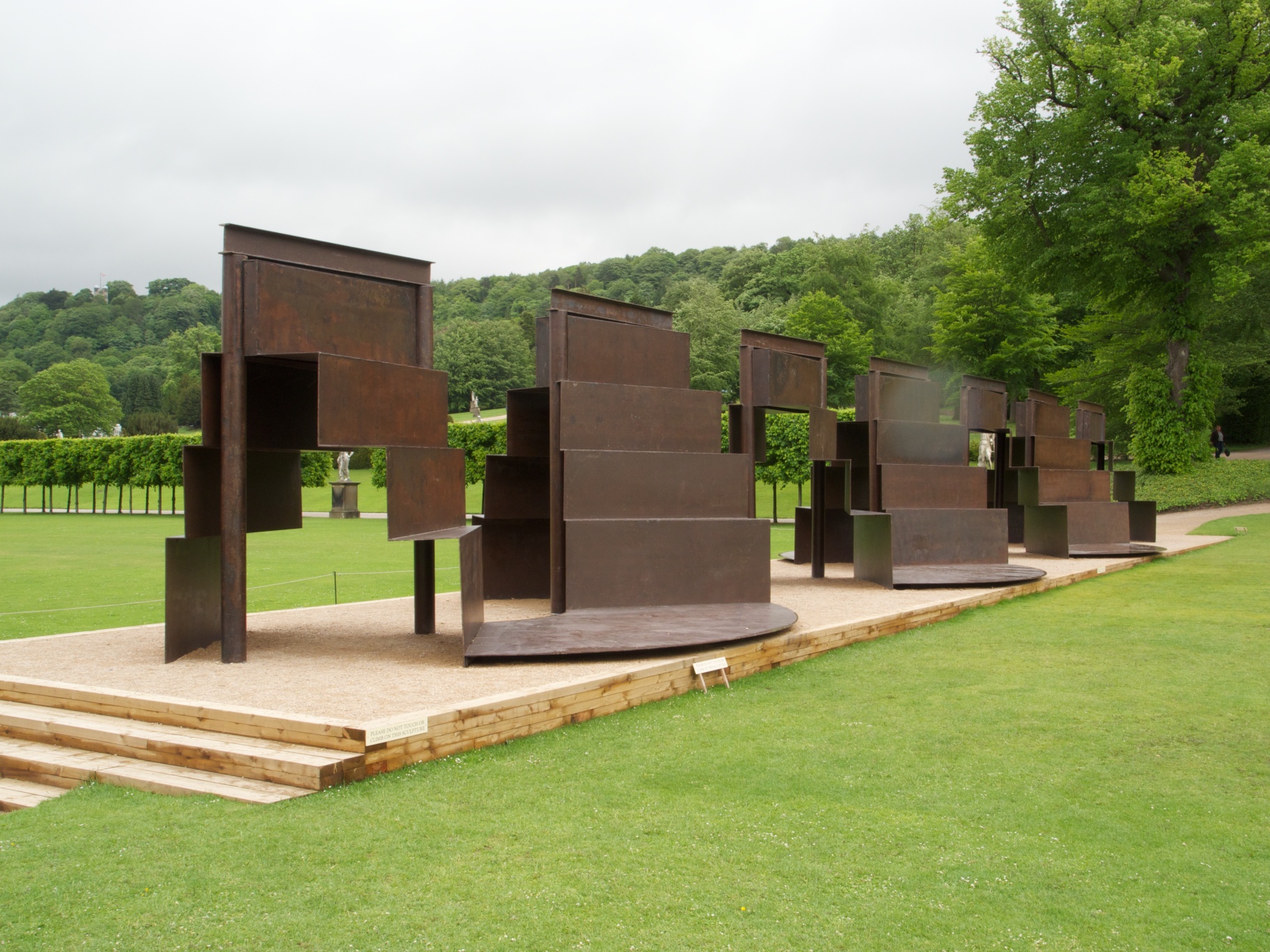 The first piece you see when approaching the Canal Pond is Goodwood Steps (1994-6). This is the most monumental of the works consisting of seven large stepped structures arrayed directly in front of Chatsworth. If ever a work was defined in terms of its context, this was it. It was the very contrast between the structure of the work and the facade of Chatsworth that defined the work, and made it one of the most interesting things in the exhibition.