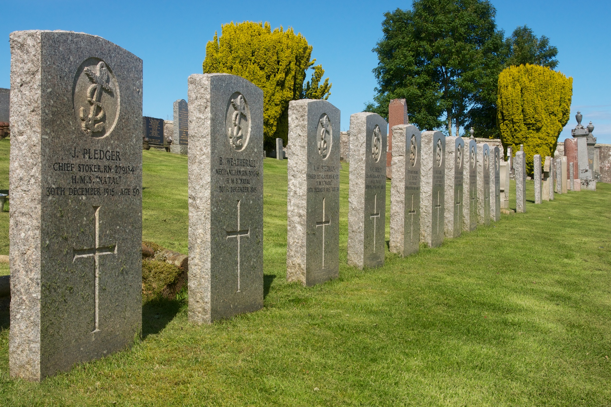 In the First World War, Invergordon onthe Cromarty Firth was an important naval base, providing a particularly well-protected deep water anchorage. HMS Natal was at anchor there on 30 December 1915, and hosting an event to which parties from shore had been invited, when she suddenly exploded. The probable cause was faulty cordite or other ammunition in the ship’s ammunition stores. The number of people lost in the explosion is listed as between 390 and 420. The graves above are just a small part of that number.