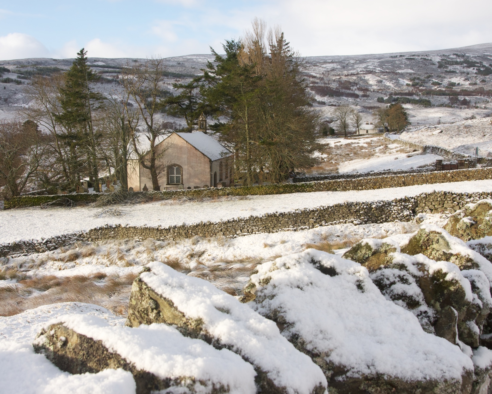 Back in the north of Scotland, and the snow has returned. It is forecast to snow for most of the day but the sun came out briefly so I thought I ought to take some pictures. This is Croick Church, famous because the churchyard prvided temporary sanctuary to families cleared from a nearby glen. The clearance was winessed by a correspondent from The Times which meant that it received national coverage.