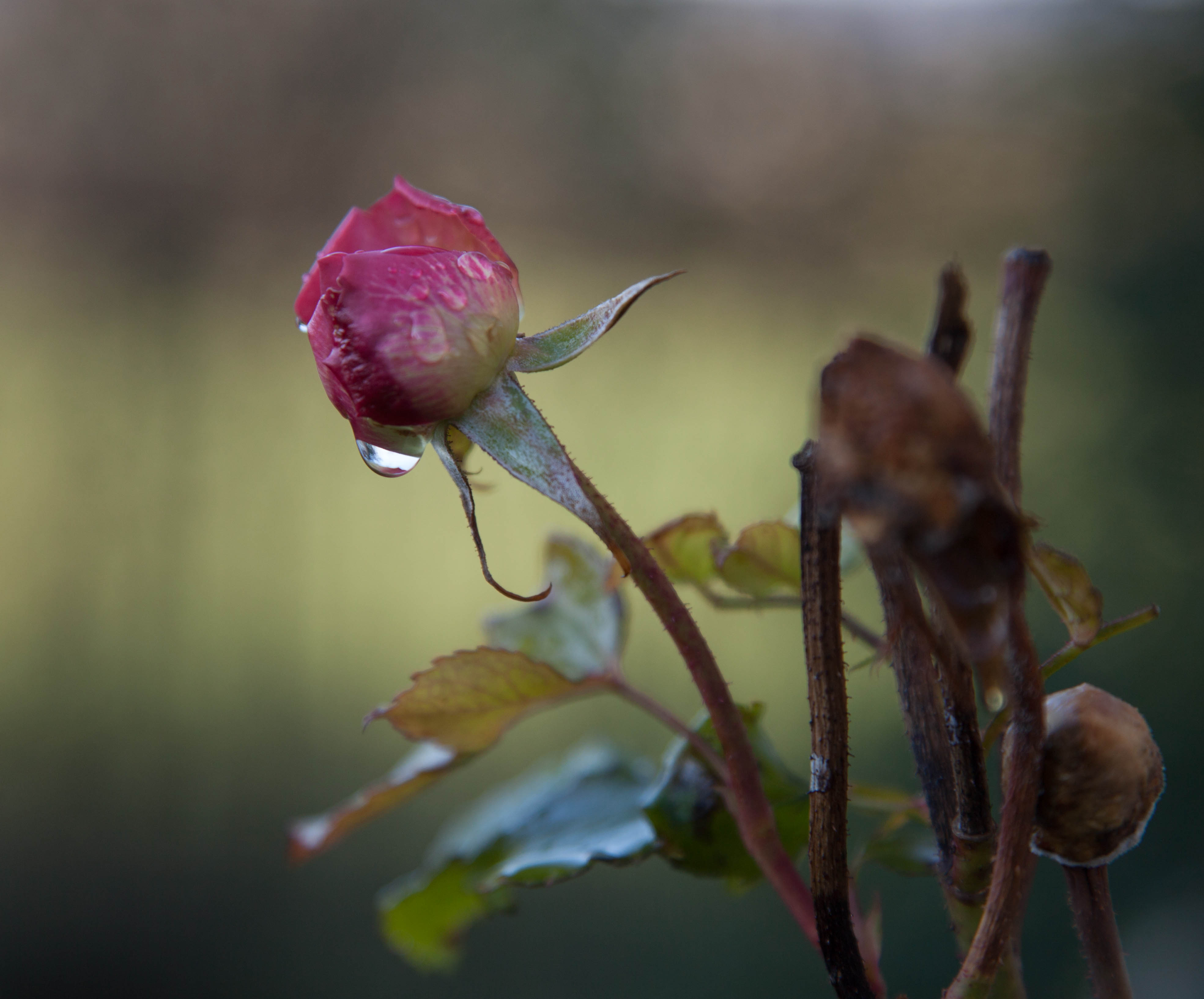 The roses should be dead at this time of the year but there has been little frost to kill them off so the odd buds continue to develop even amongst otherwise dead foliage. This one seemed worth capturing as the last rain dripped from it.