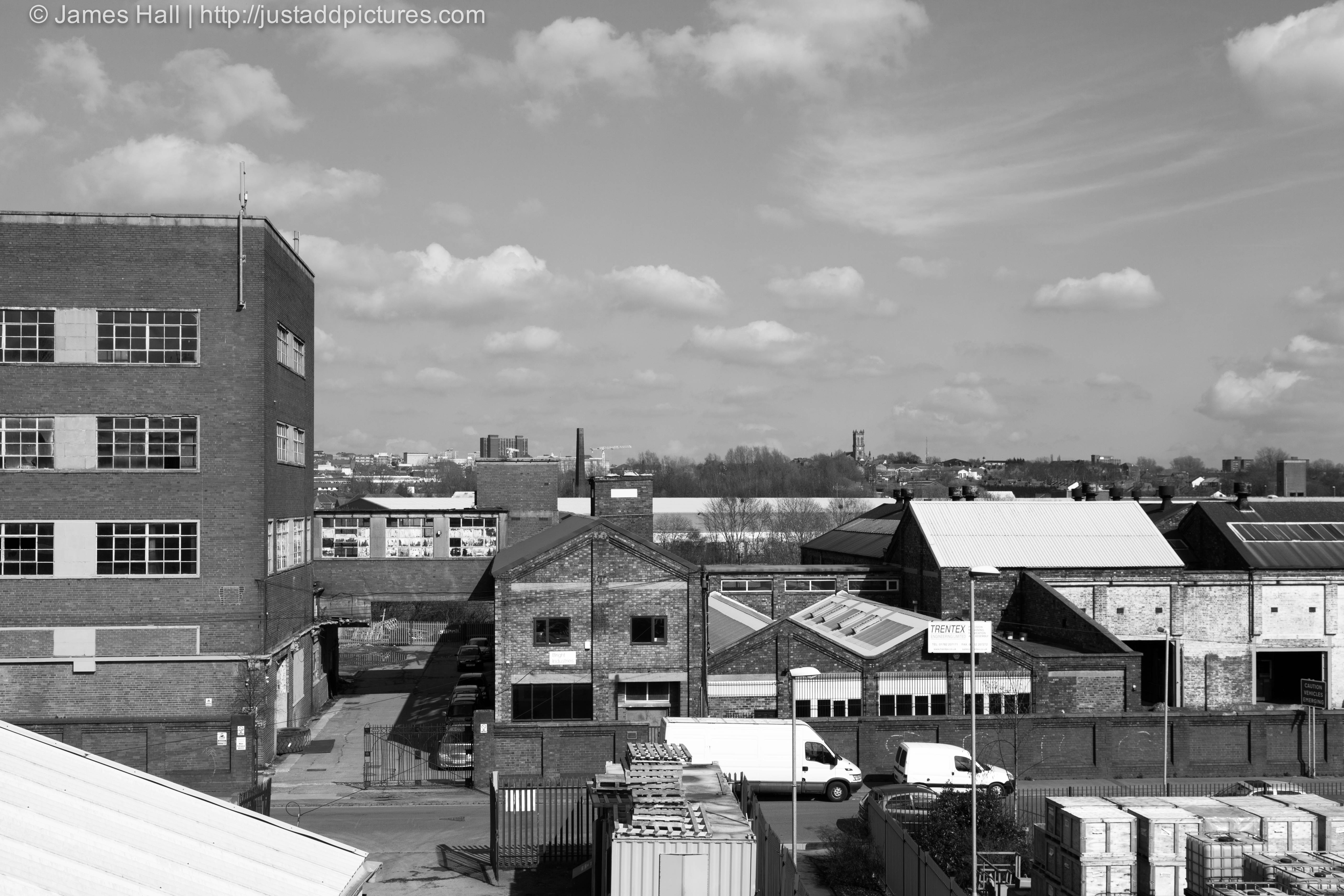 I took this picture from an pedestrian walkway over the A500, the dual carriageway which takes you round Stoke. It is not a flattering view of Stoke but the industrial units in the foreground are a fair representation of industrial, working Stoke. It was a subject which I thought would benefit from a black and white treatment.