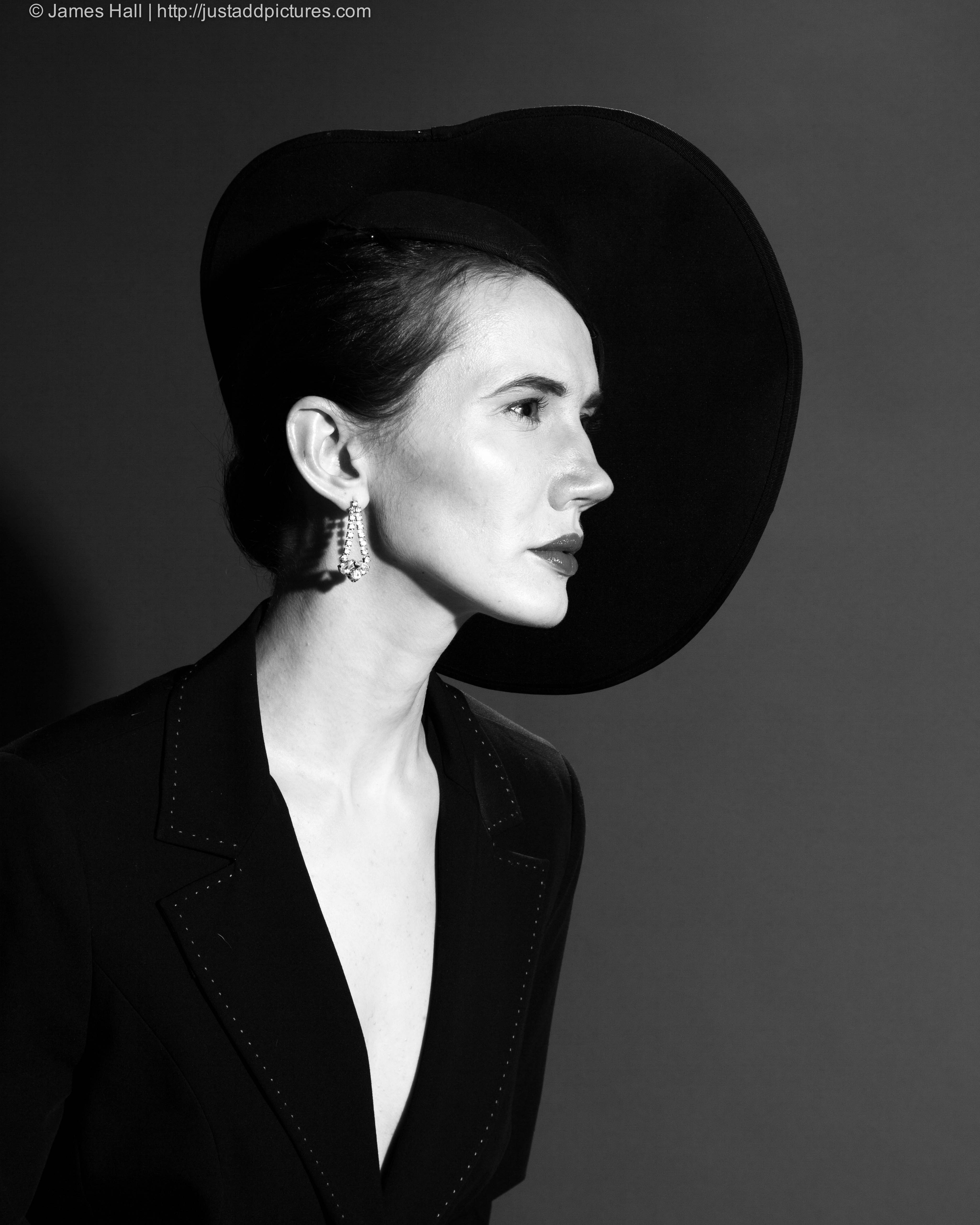 I have long been attracted by pre-war black and white fashion and Hollywood studio shots by photographers like Horst and Hurrell. Their use of light to create dramatic effect was superb and this shoot was an attempt to recreate that sense. As with all good shoots, it was very much a team effort and many thanks to the team credited below.20141216-Hat-045
