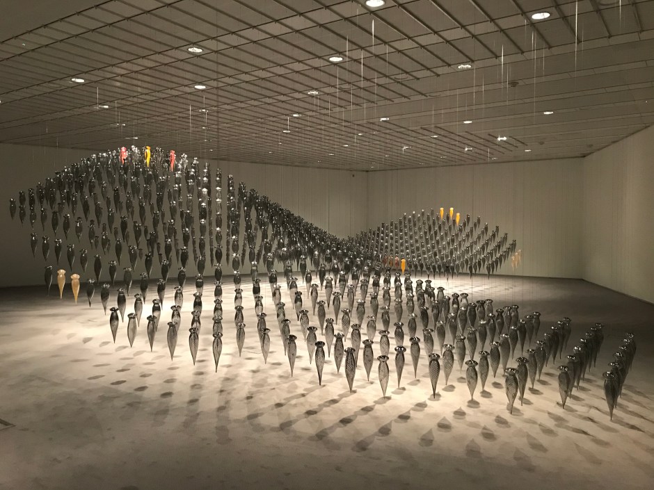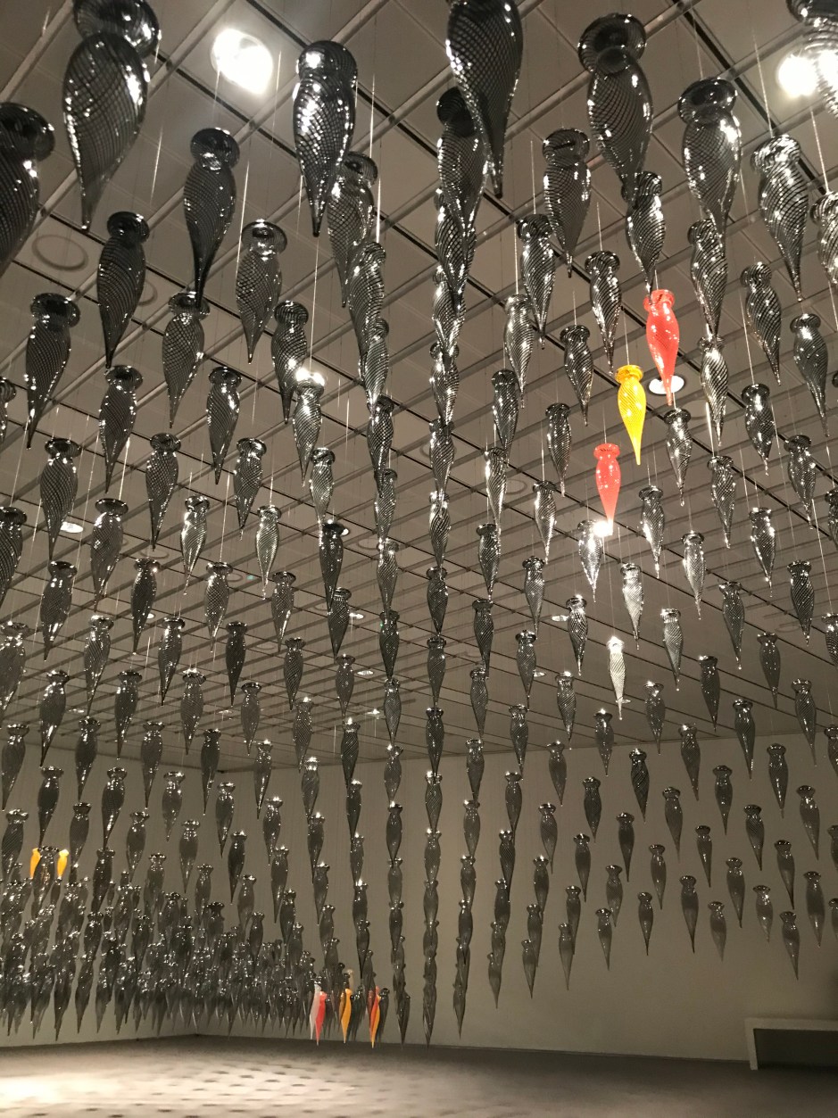 We visited the Sainsbury Centre in Norwich last week, primarily to see the wonderfully diverse permanent collection. But also on show was an exhibition of work by Magdalene Odundo. Odundo is first and foremost a world leading potter but she has also created the fascinating piece featured here consisting of 1001 glass pins suspended in a matrix from the ceiling. The piece has been installed several times in different locations, configured differently in each case.
